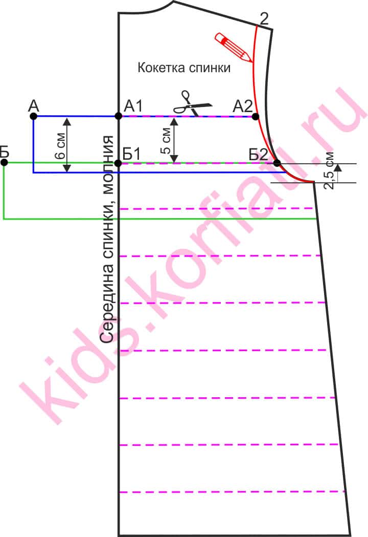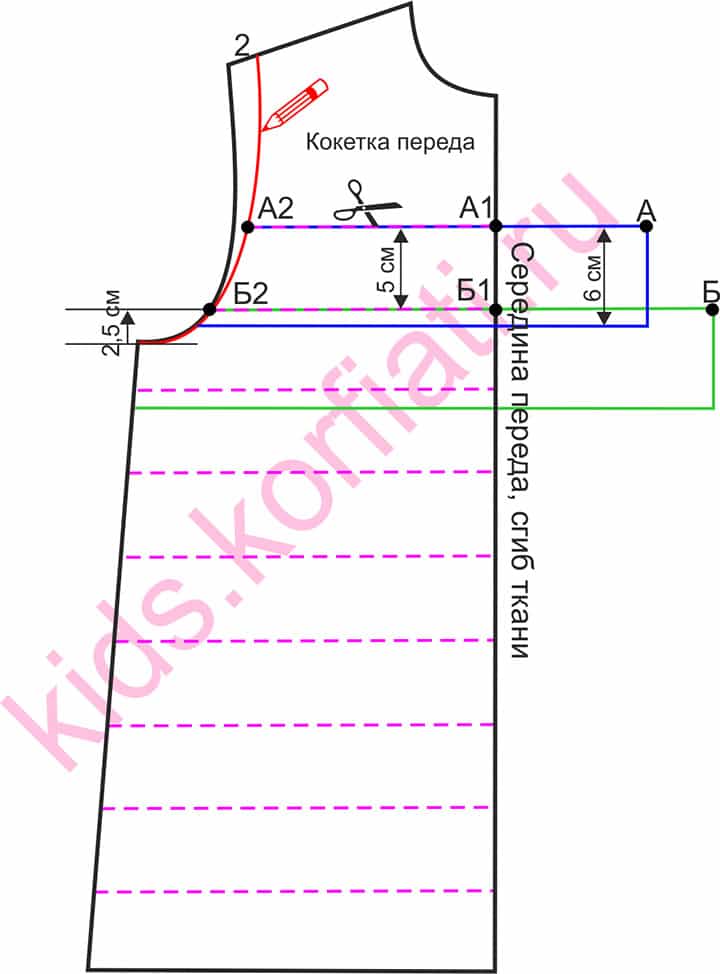 На выкройке спинки платья укоротите длину плеча на 2 см. От нижней точки проймы отложите вверх 2,5 см, проведите горизонтальную пунктирную линию. От первой линии отложите вверх 5 см и проведите вторую линию. Отрежьте кокетку спинки платья. Расчертите нижнюю часть переда и спинки платья – наметьте места притачивания оборок. Ширина каждой оборки 6 см, расстояние между оборками (обозначено пунктирными линиями сиреневого цвета) — 5 см.
