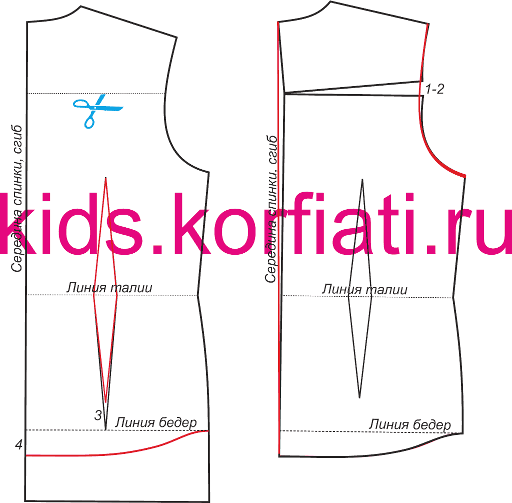 Разрежьте спинку горизонтально, таким образом, чтобы разрез проходил чуть выше центра проймы. Раздвиньте спинку по разрезу на 1-2 см (в зависимости от глубины нагрудной вытачки – чем глубже вытачка, тем больше раздвигают). Спрямите среднюю линию спинки.