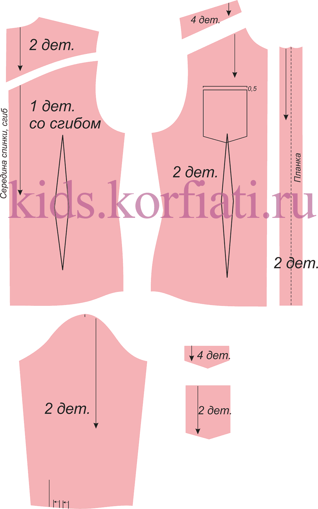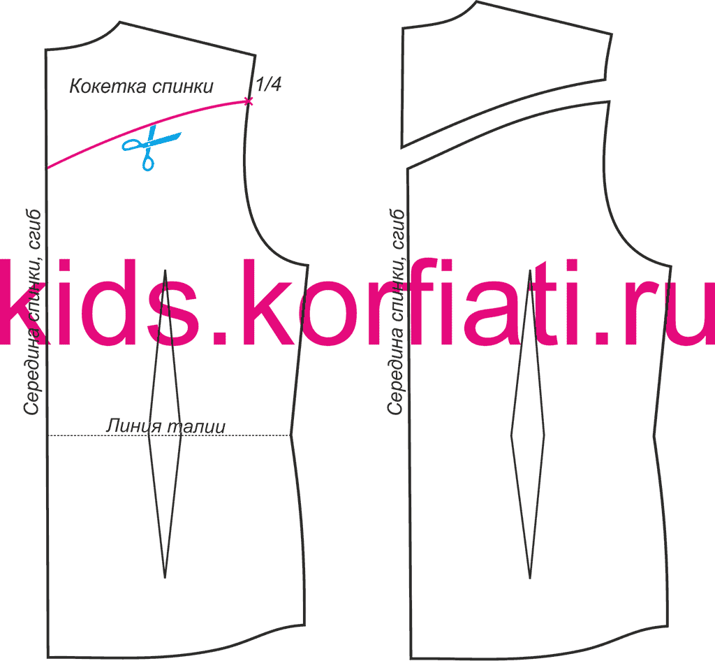 - Кокетка спинки – 2 детали со сгибом