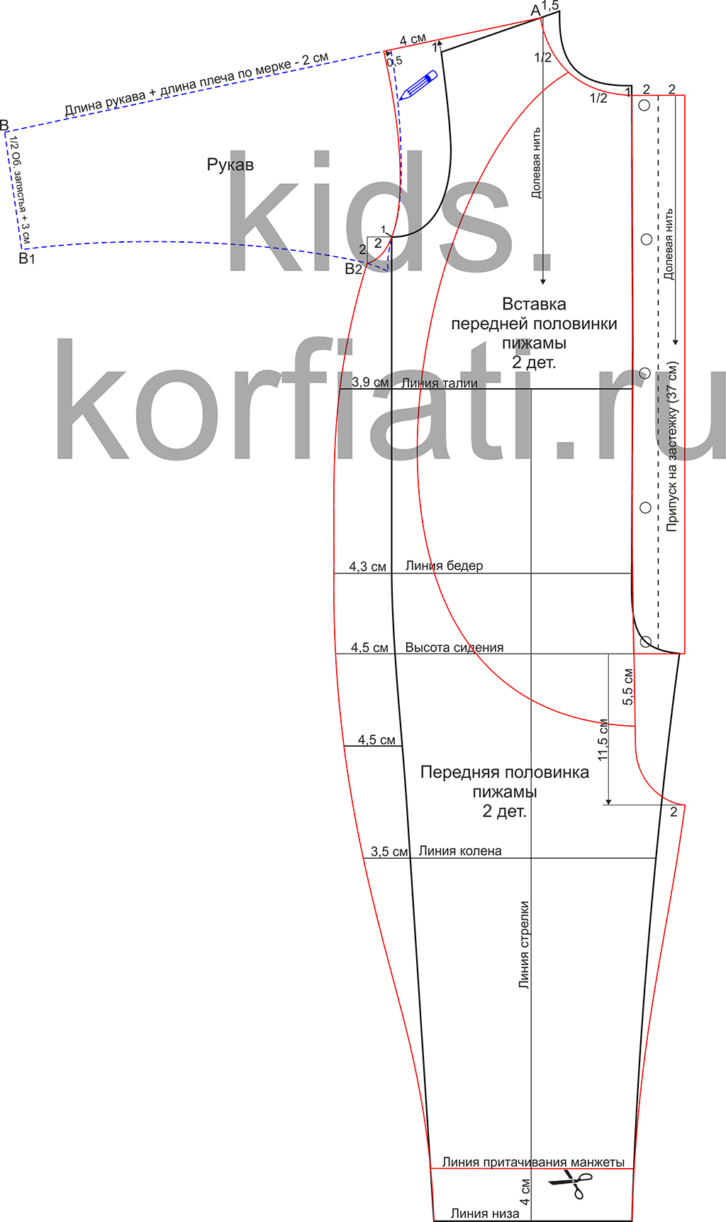 Моделирование выкройки выполнено на 28 размер, рост 104-110 см, для других размеров используйте собственные мерки и прибавки, чтобы смоделировать выкройку пижамы по нашей инструкции.