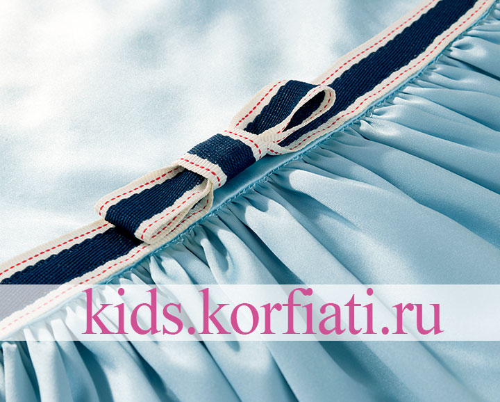 Платье декорировано контрастной хлопчатобумажной бейкой (рис. 3). Бейку настрочите по линии талии с обеих краев. Сшейте бантик шириной 9 см и пришейте по центру лифа переда.