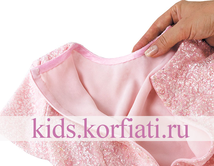 Совет! Детали кроя из глиттера полностью дублируются деталями подкладочной ткани (в качестве подкладочной ткани рекомендуем использовать натуральные ткани — сатин, поплин, креп и т. п). Наложите детали из глиттера на детали подкладочной ткани и сметайте по контурам. Далее шейте платье как однослойное. В процессе пошива припуски срезайте до 0,7 см и обтачивайте косыми бейками.