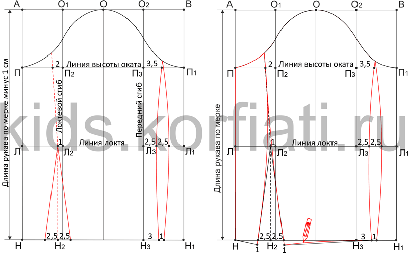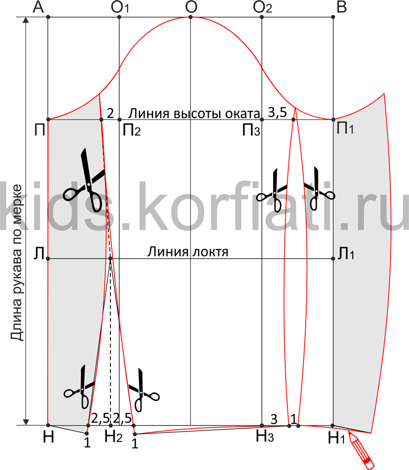 Удлините линию низа рукава от точек 2,5-2,5 на 1 см и соедините точки Н-1 и 1-Н3 прямыми отрезками. Участок линии низа рукава между точками 1-Н3 слегка скруглите.