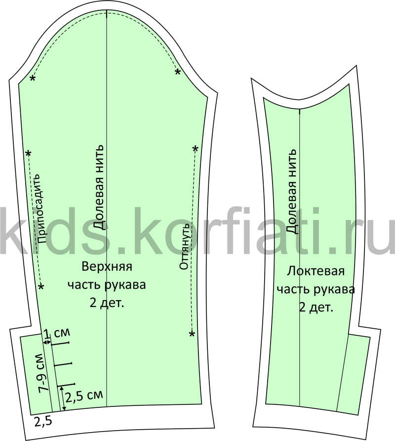 Как уже понятно из названия, двухшовный рукав, в отличие от одношовного, состоит из двух частей — верхней и локтевой — и имеет два шва (локтевой и нижний). Крой двухшовного рукава более эргономичный, повторяющий естественный изгиб руки.
