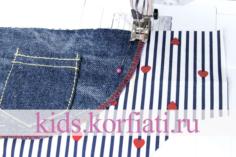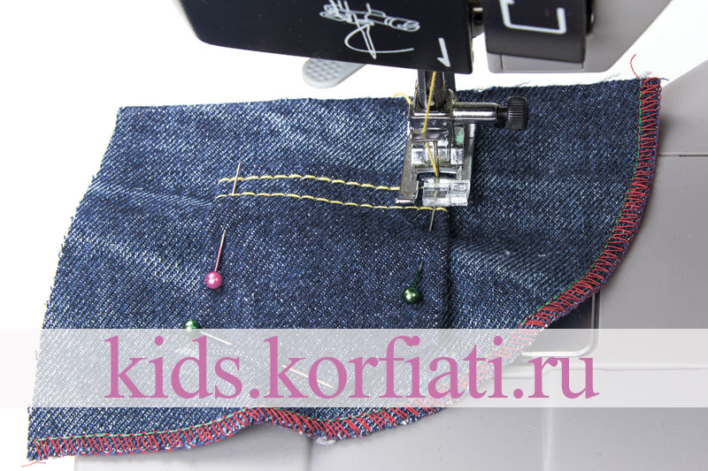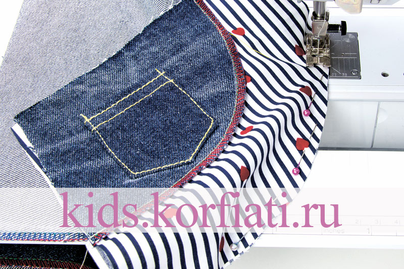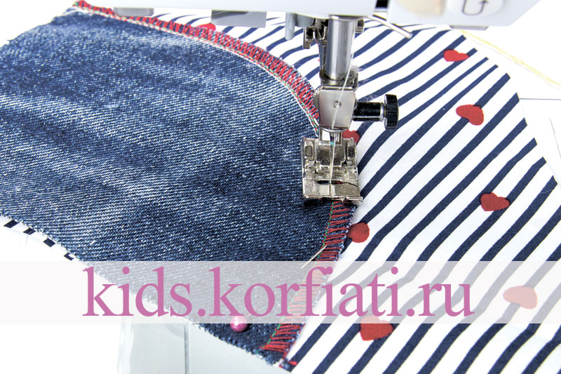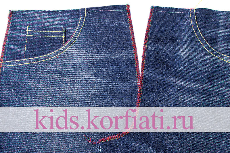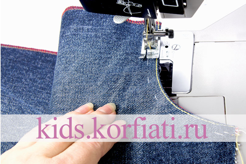 Правый бочок из джинсовой ткани обметайте по скругленной стороне. Затем наложите на правую мешковину кармана из хлопчатобумажной ткани по разметке и настрочите по краю.
