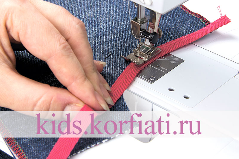 С лицевой стороны по линии входа в кармана наложите киперную ленту шириной 0,7 см и притачайте ее по левой стороне близко к краю.